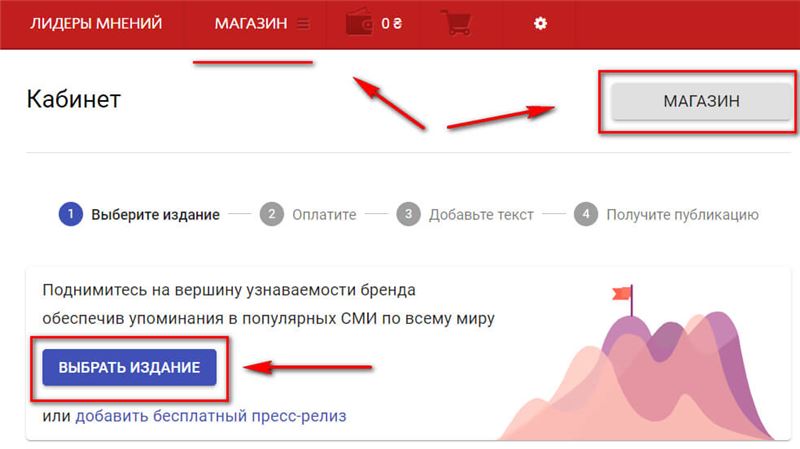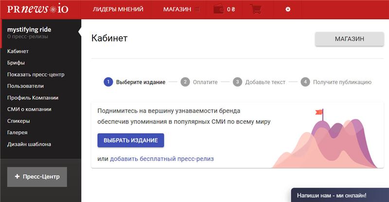 Після простої реєстрації рекламодавець потрапляє до особистого кабінету, де можна відразу розпочати вибір видань для публікації статей.